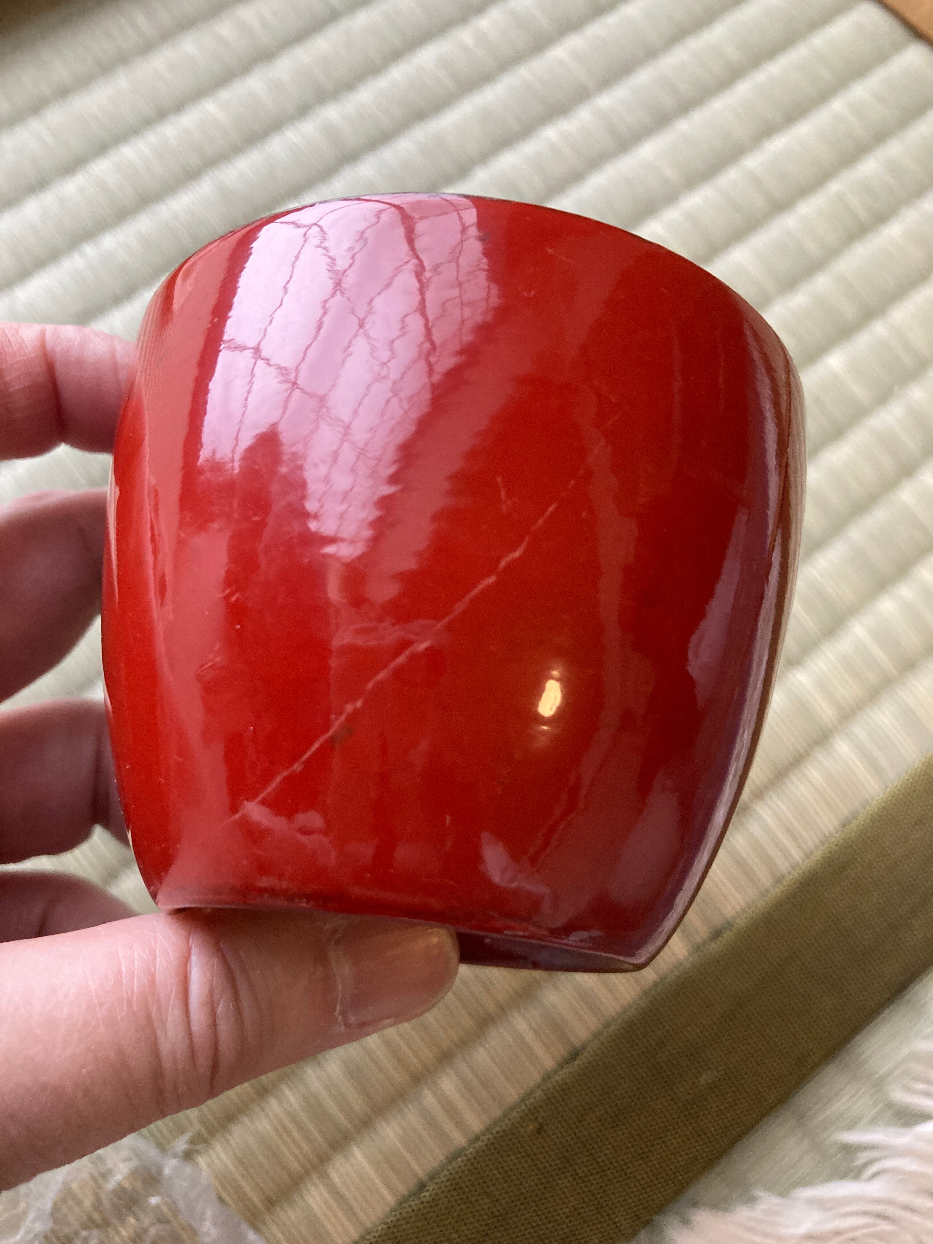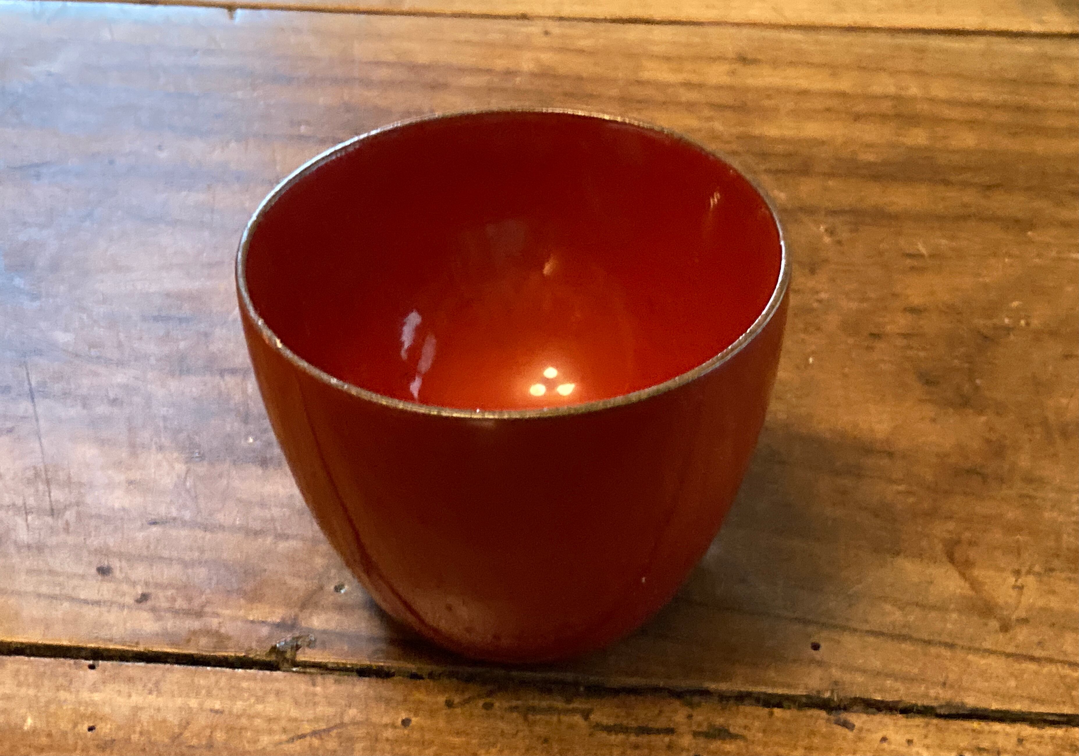 小さな朱塗りのカップ(猪口)です。艶やかな漆塗りの器は食卓のアクセントとして活躍します。ちょっとした珍味を盛ったり、ナッツ類を入れて使っても重宝します。
