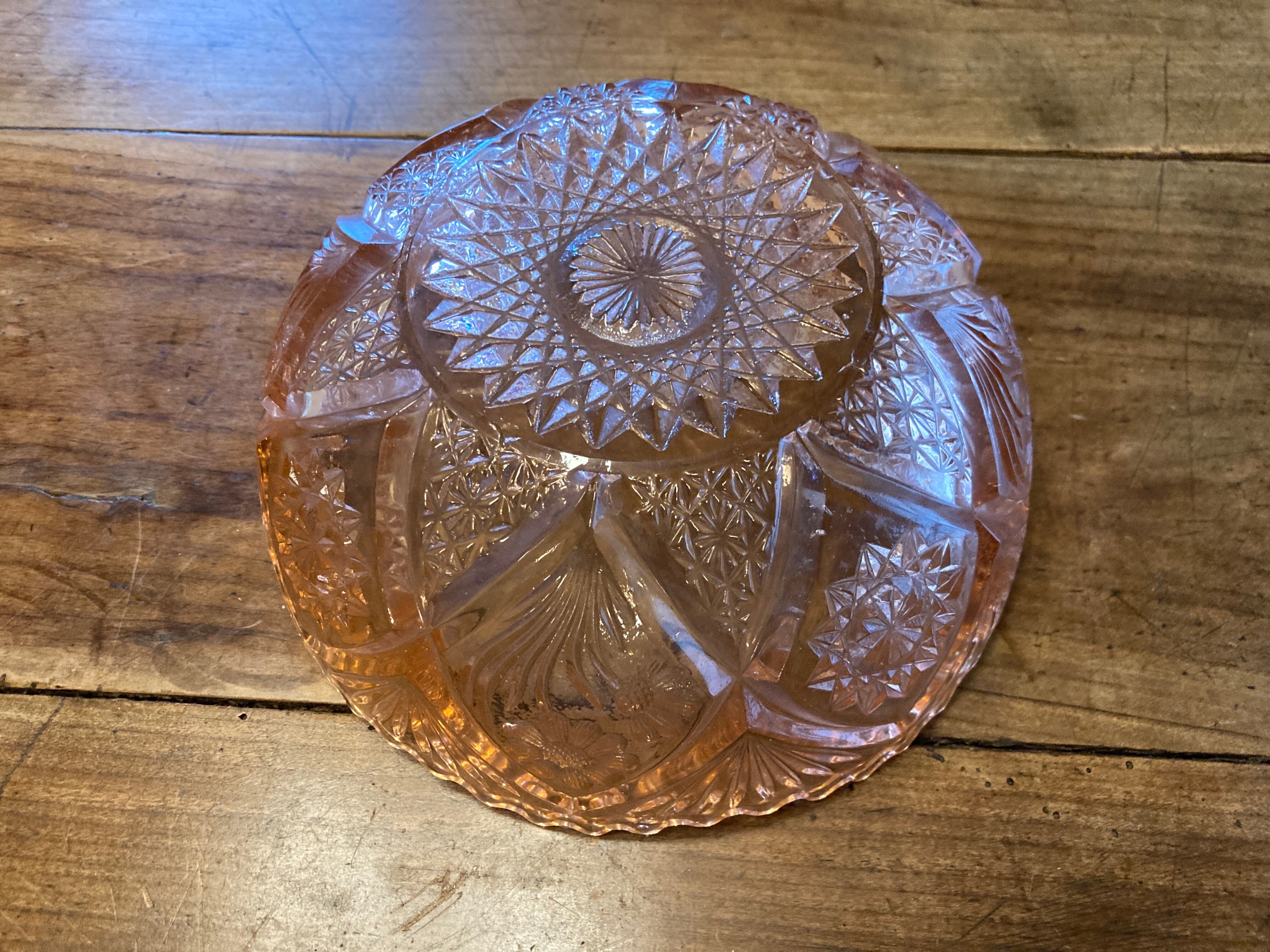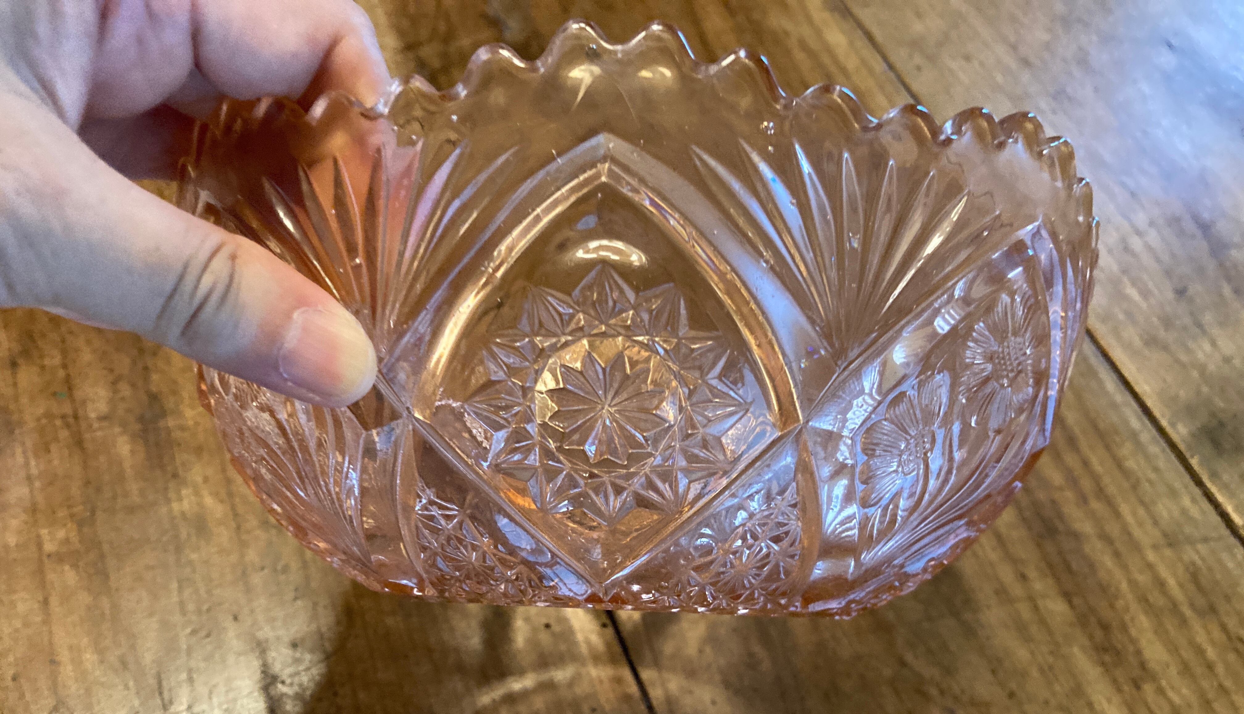 柔らかいベージュピンクの型ガラスのボウルです。サラダボウルにぴったりの大きさです。菓子鉢にしても似合います。これ1つで食卓が可愛らしく華やかになります。