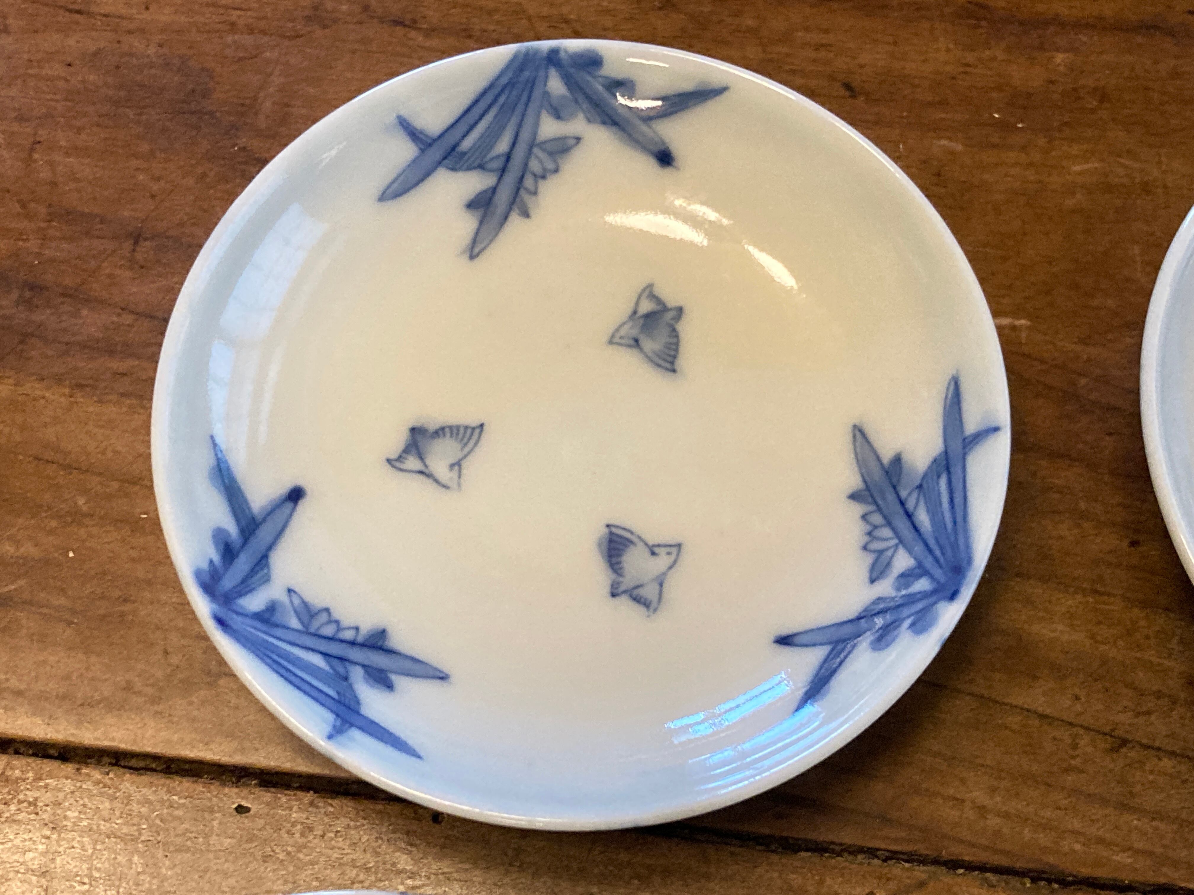 表にも裏にも藍色で丁寧に絵付けをされた、愛らしい小皿です。小鳥が3羽飛んでいます。微妙に異なる絵付けで全て手描きされたものと思われます。すっきりした白地に藍色の配色は、洋食器に合わせても違和感がありません。コレクションの一つに是非いかがですか?