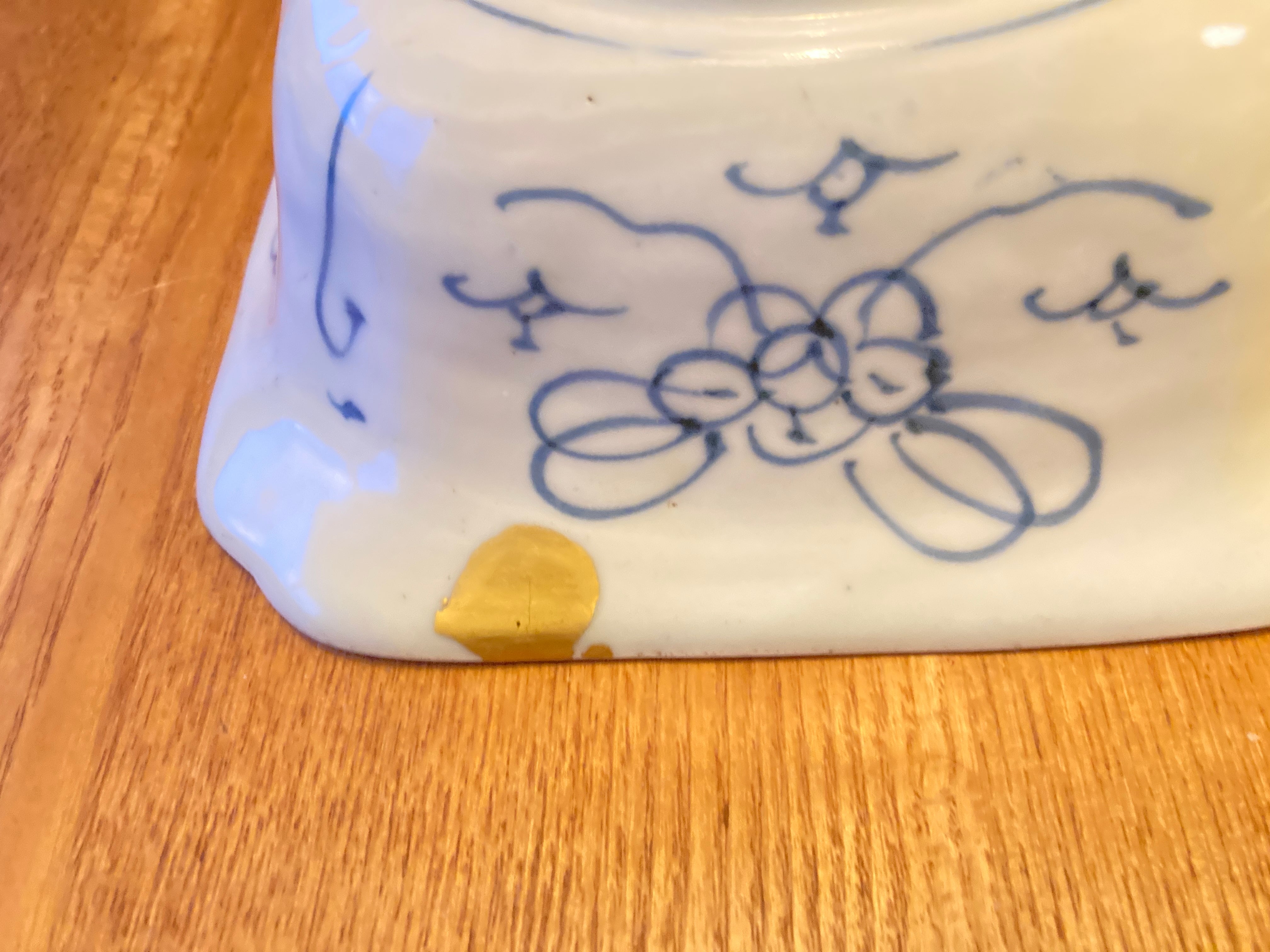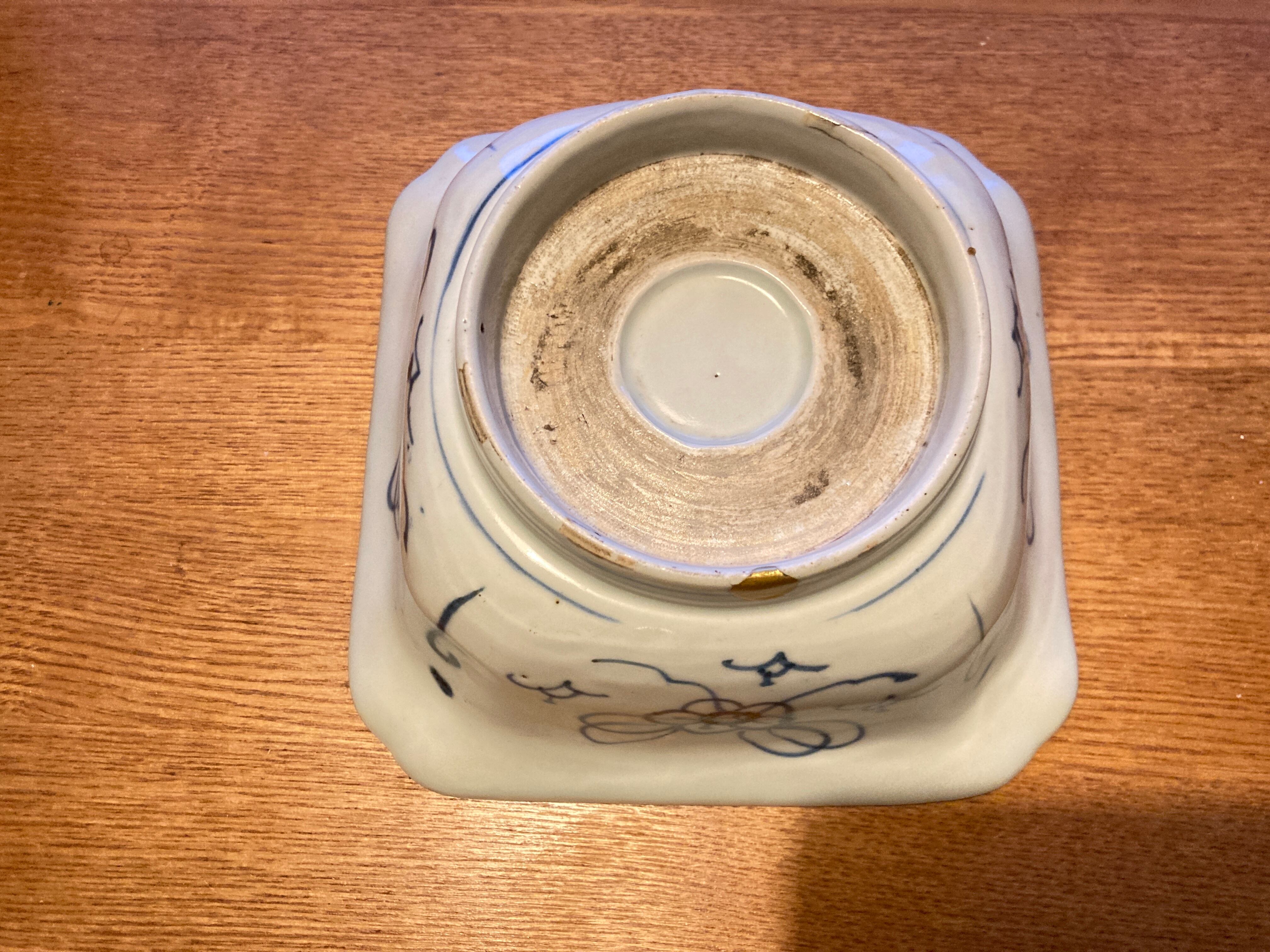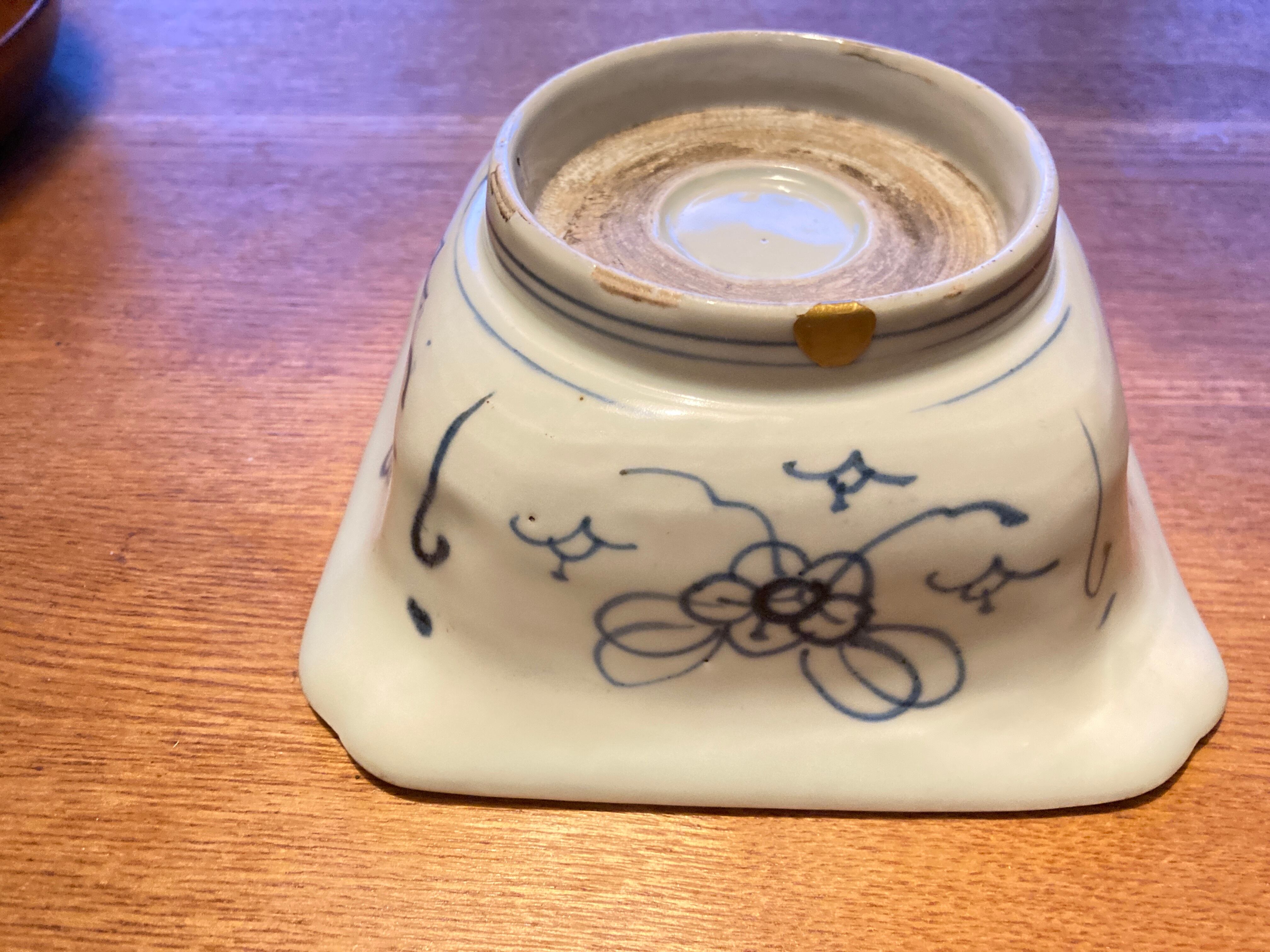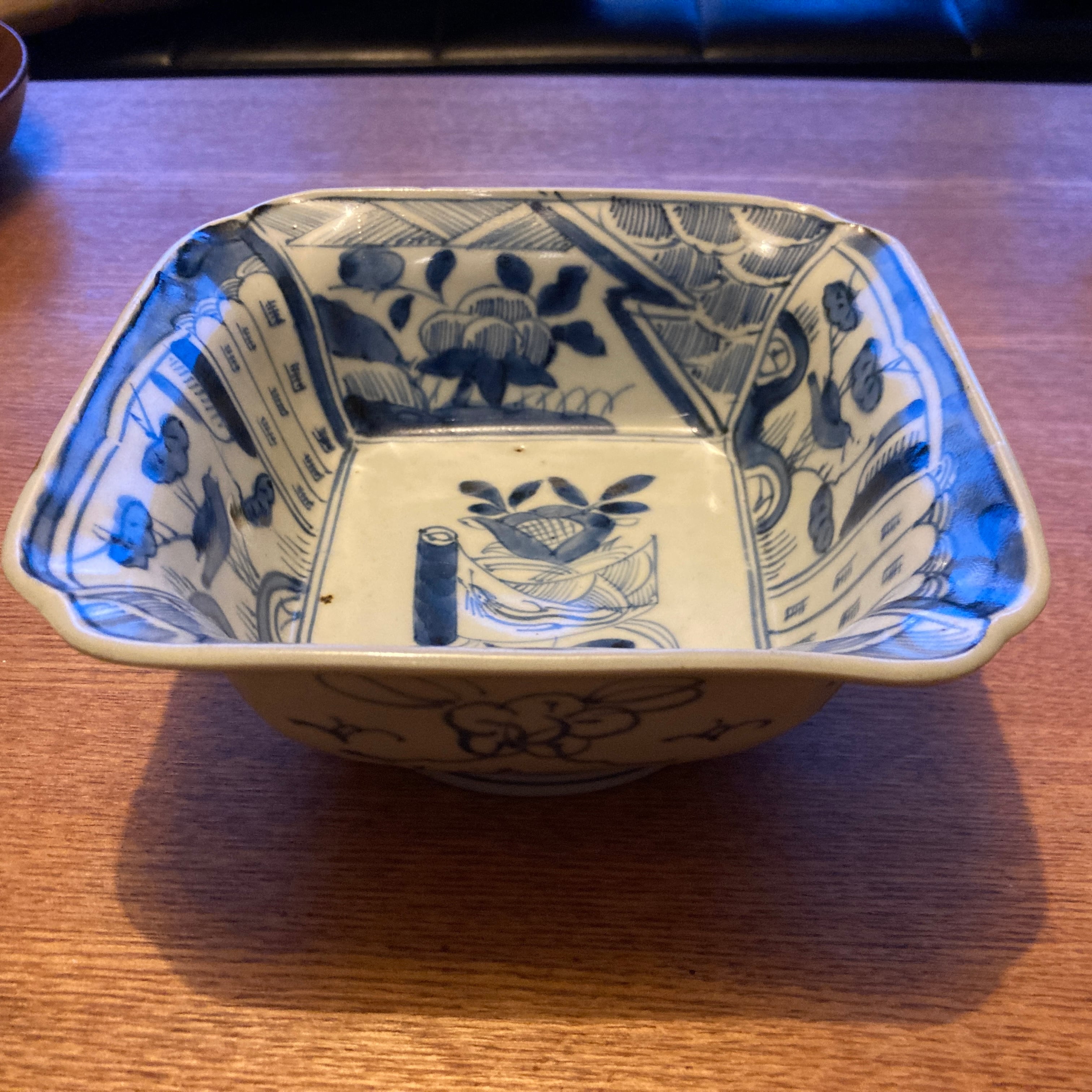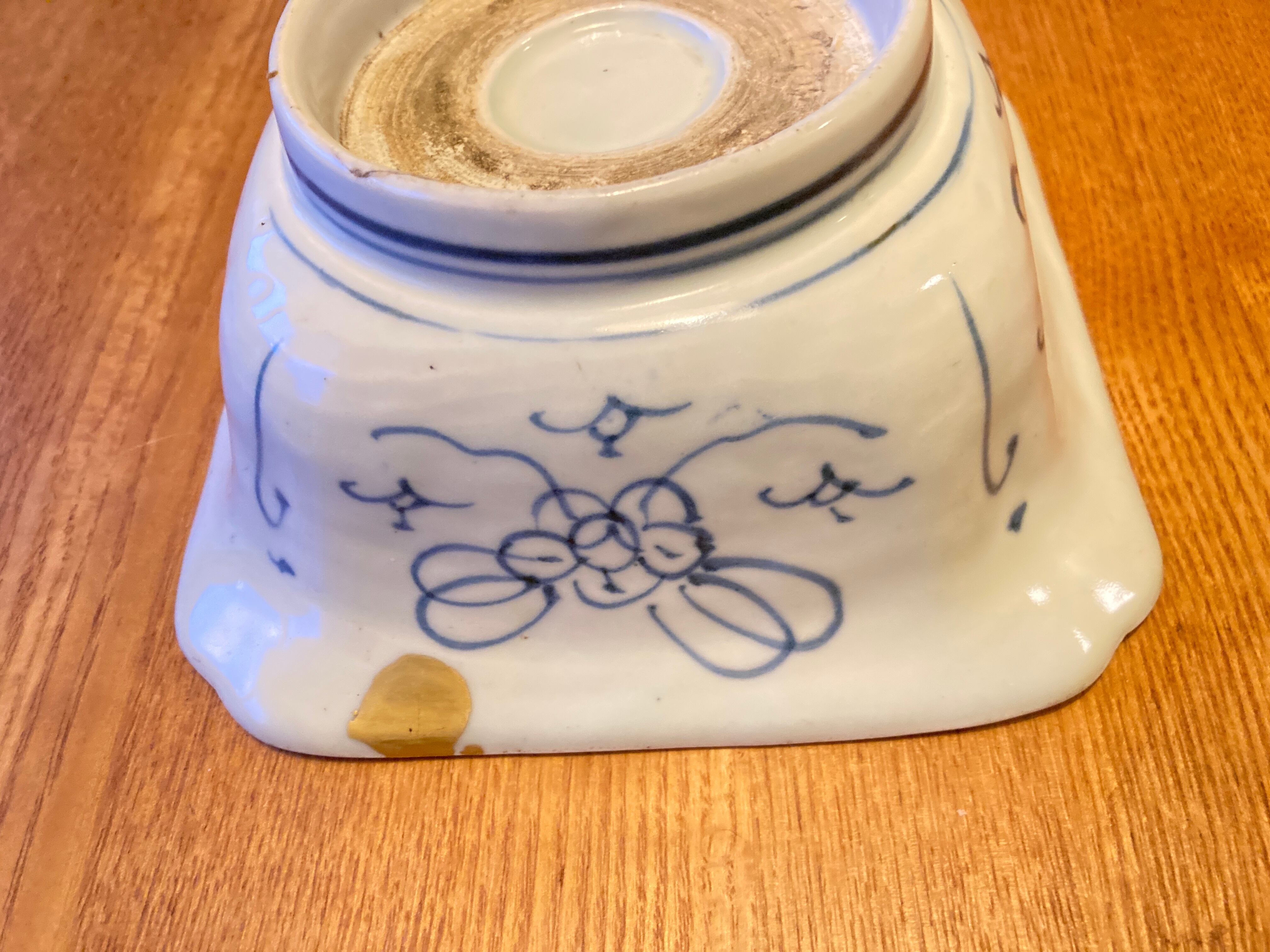 伊万里や骨董がお好きな方に愛用していただきたい一品。藍色で丁寧に絵付けをされた角鉢です。植物と反物?の柄が中央に描かれ、幾何学模様などの絵も描かれ、器の内側一面に絵付けが施されています。すっきりした白地に藍色の配色は、洋食器に合わせても違和感がありません。煮物を盛ったりがぴったりのサイズ感で、使い勝手の良いサイズ感です。高台と縁に欠けがあったので、岩手在住の女性漆作家さんに依頼して金直しをしています。この直しで、うつわの味わいが深くなっているようです。コレクションの一つに是非いかがですか?