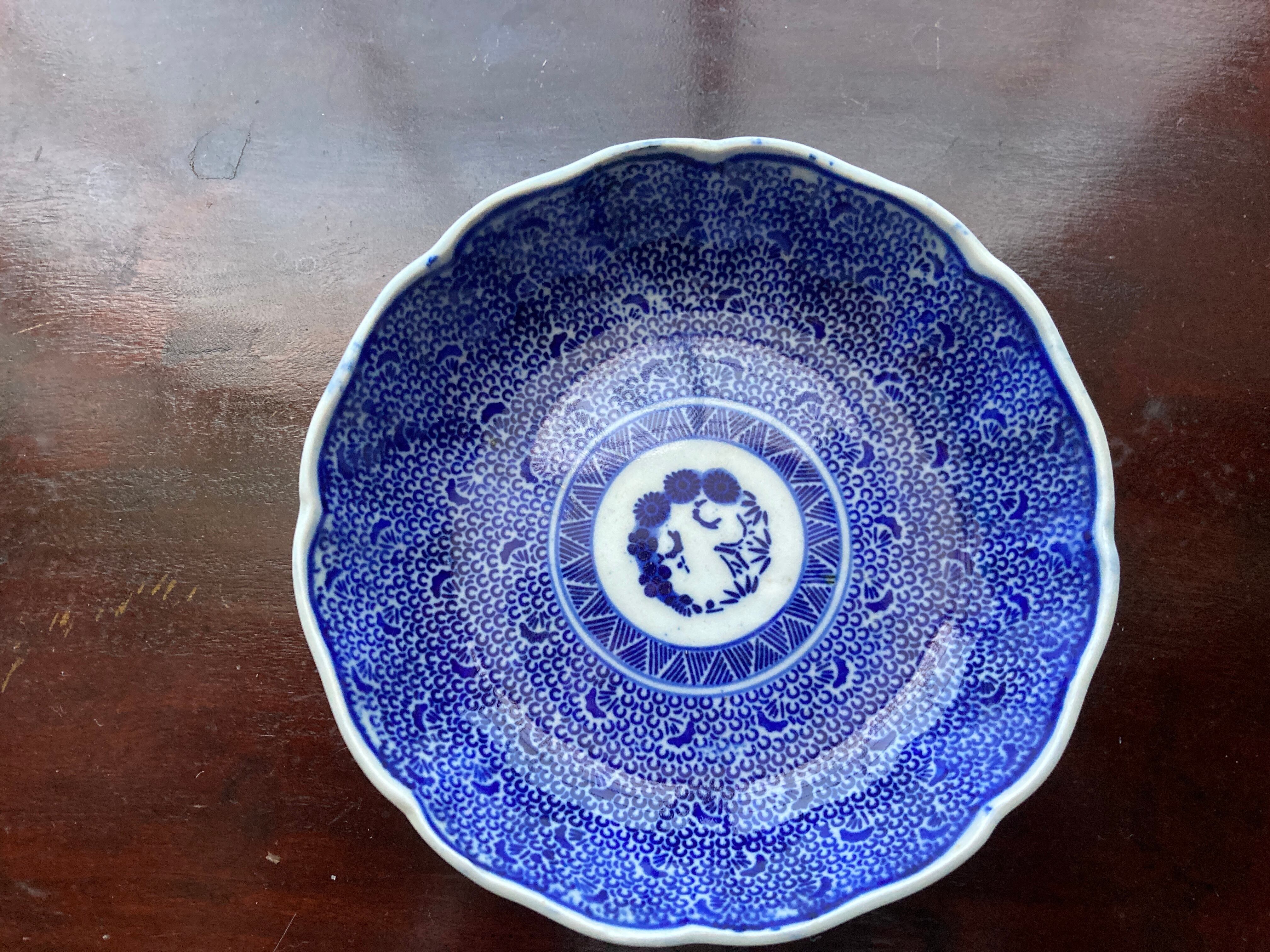染付(藍色)の印版で外側は手書きです。日常使いで気軽に使っていただきたい、使いでの良いうつわです。鍋料理の取り皿に、ピッタリです。気取らない雰囲気の和の骨董のうつわ。ぜひ1枚どうぞ♬