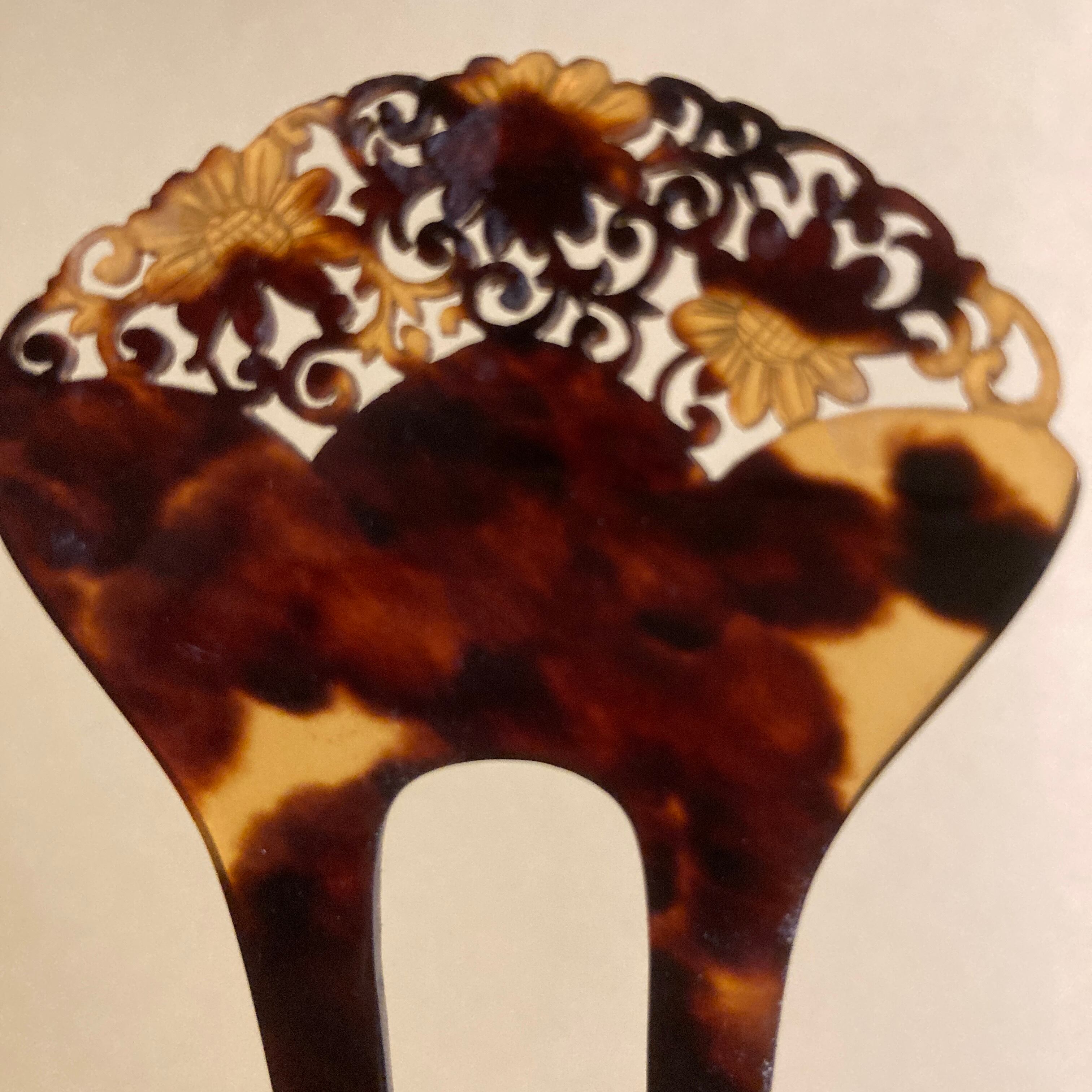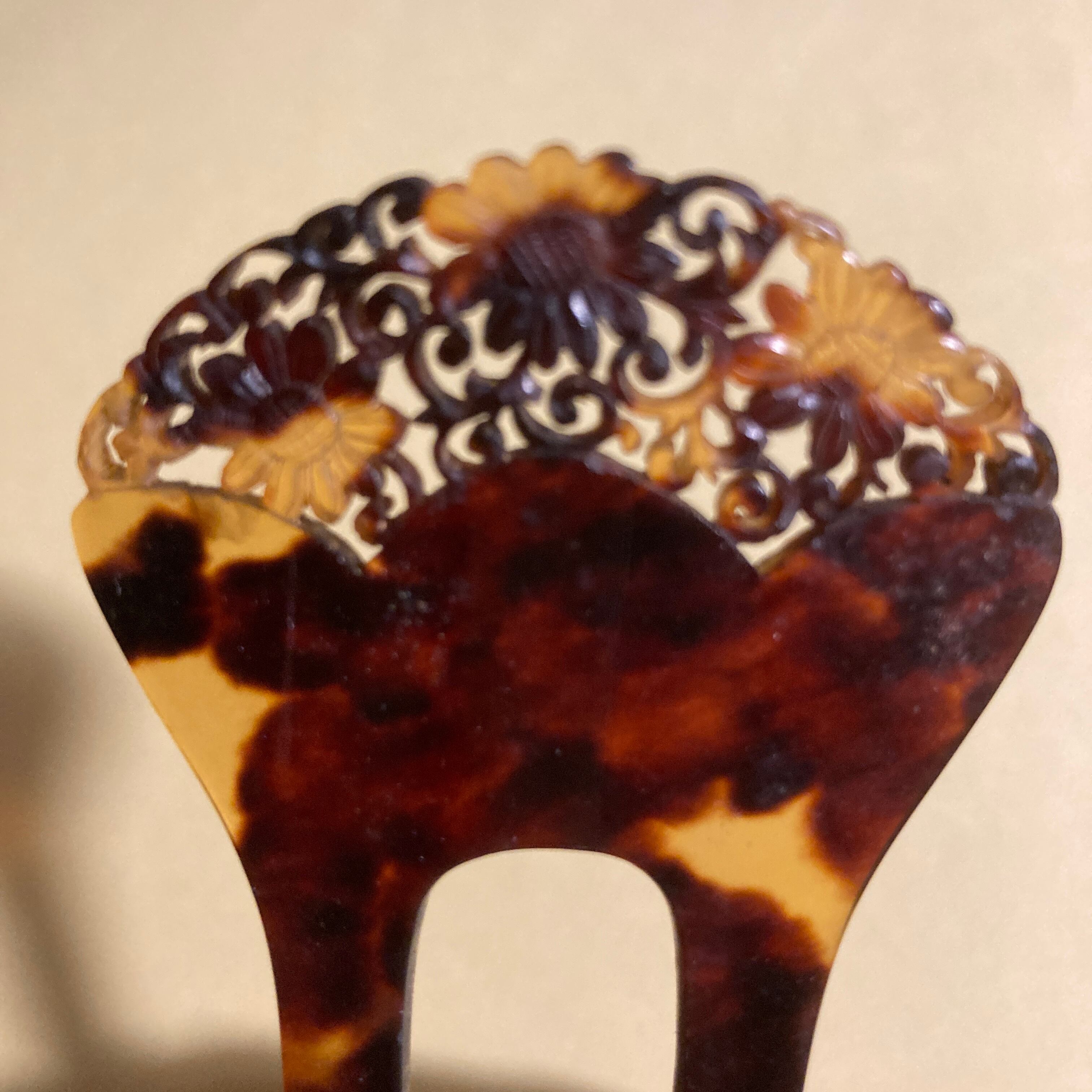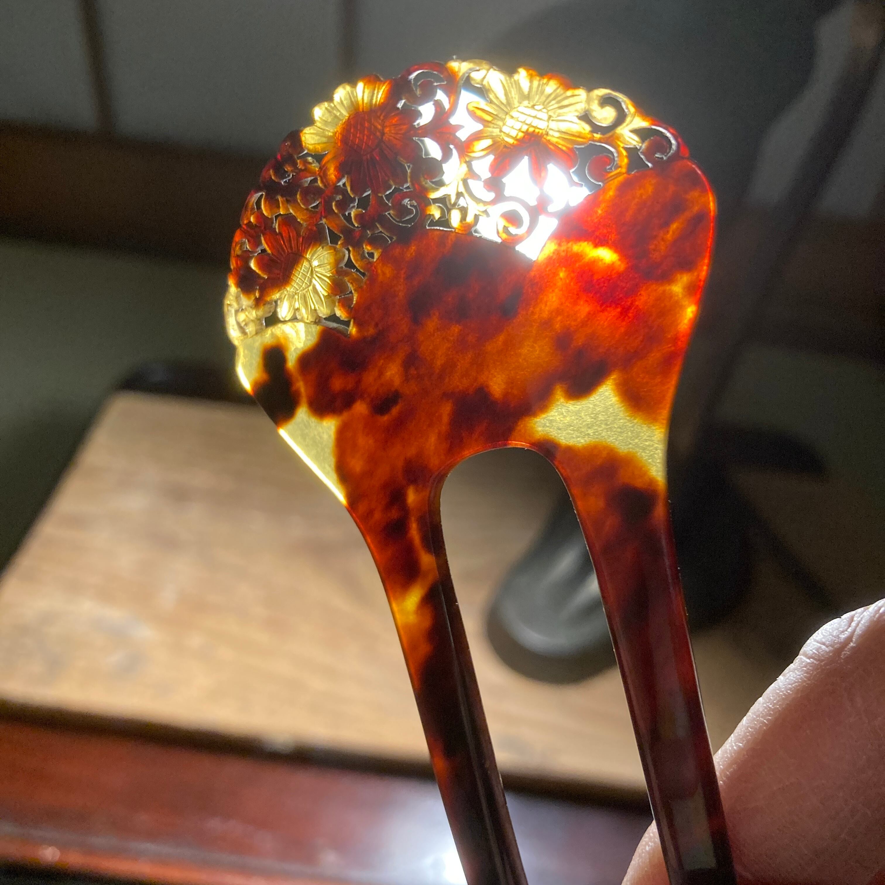 大正ロマン風デザインの、鼈甲の透かし彫りかんざしです。細かい透かし彫りが施された、大変繊細で貴重なお品物です。鼈甲細工のかんざしはよく見かけますが、これだけ繊細に透かし彫りが施されたお品物は珍しいです。おそらく現代ではここまで細かいものは技術的に難しいのだと思います。