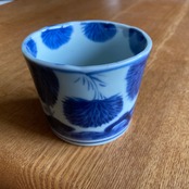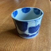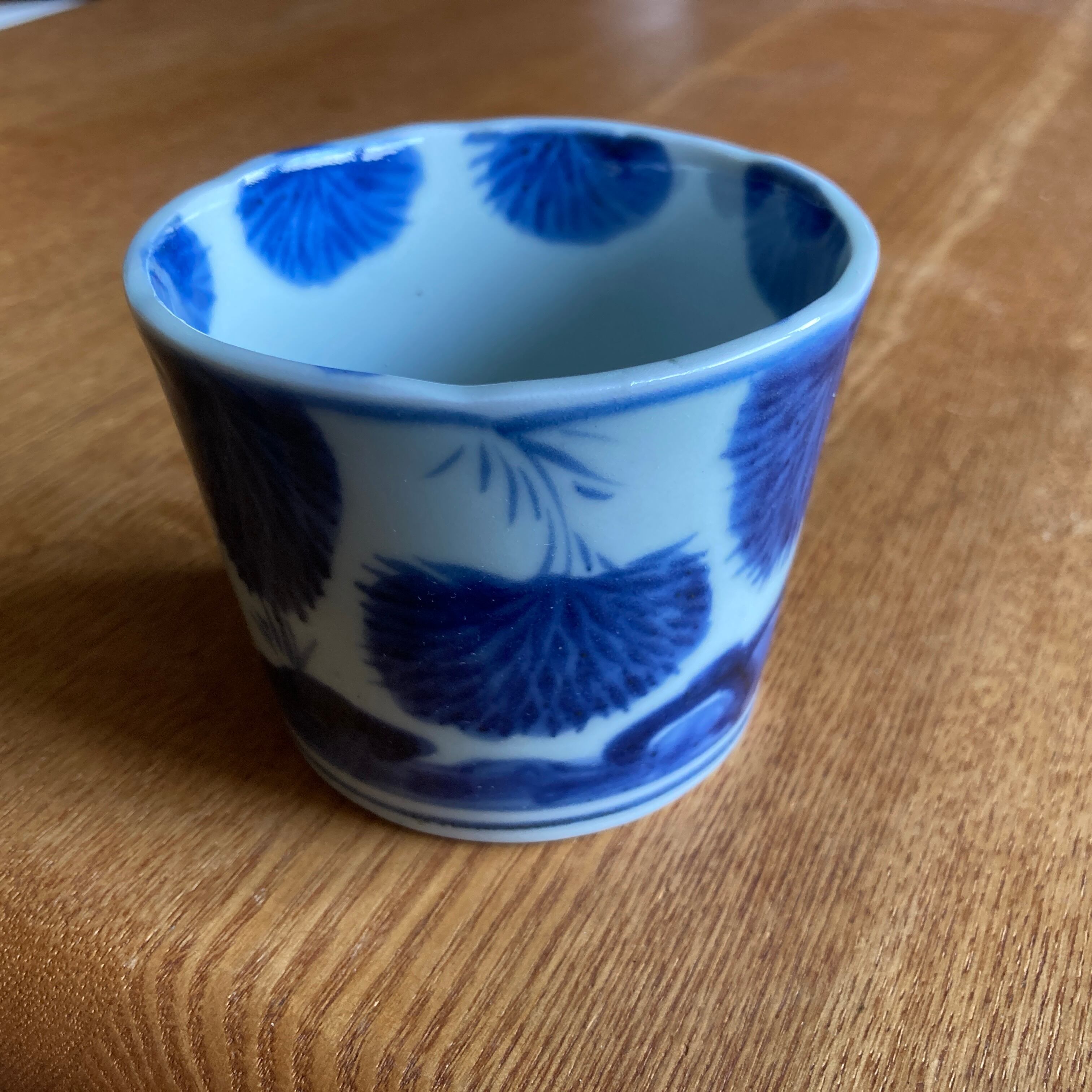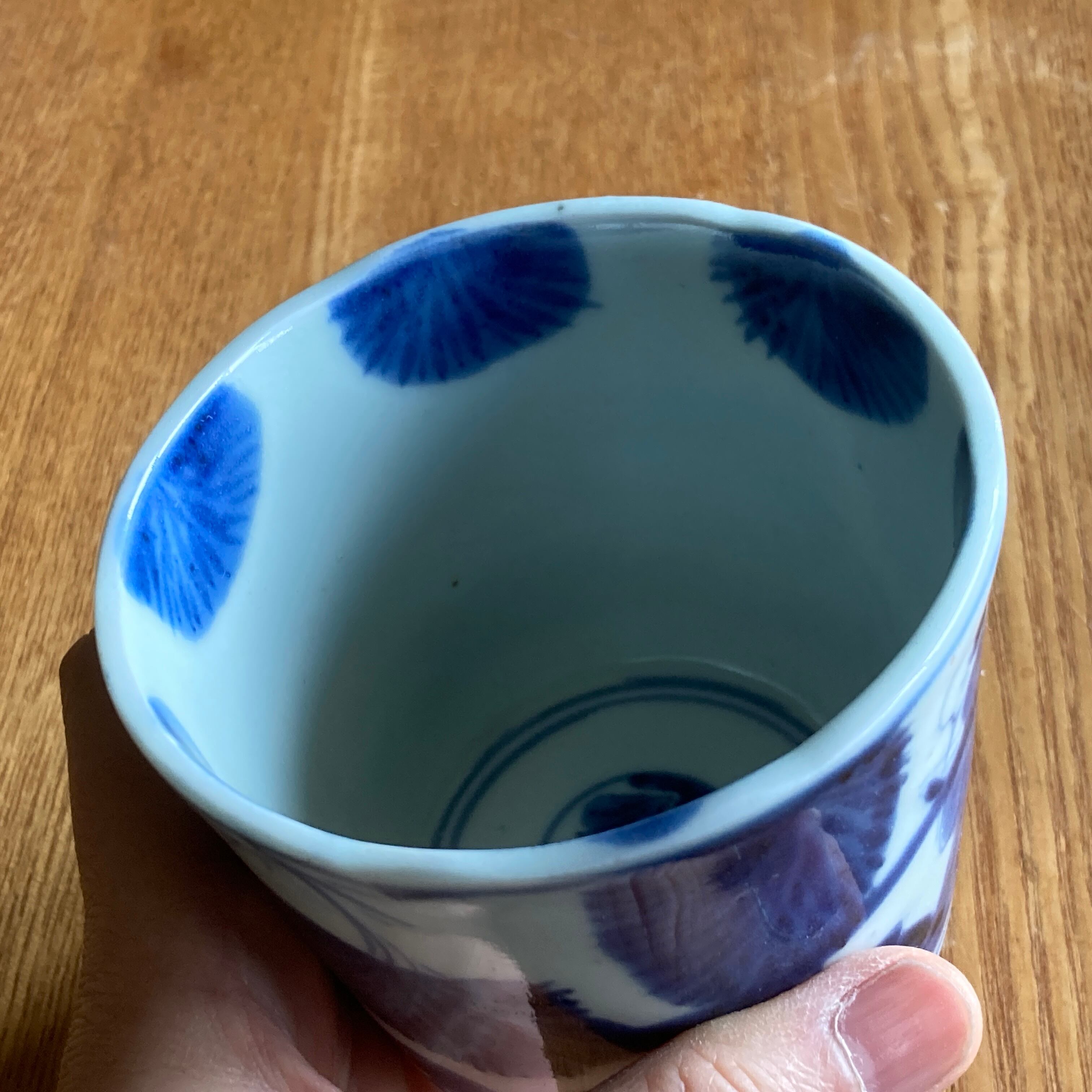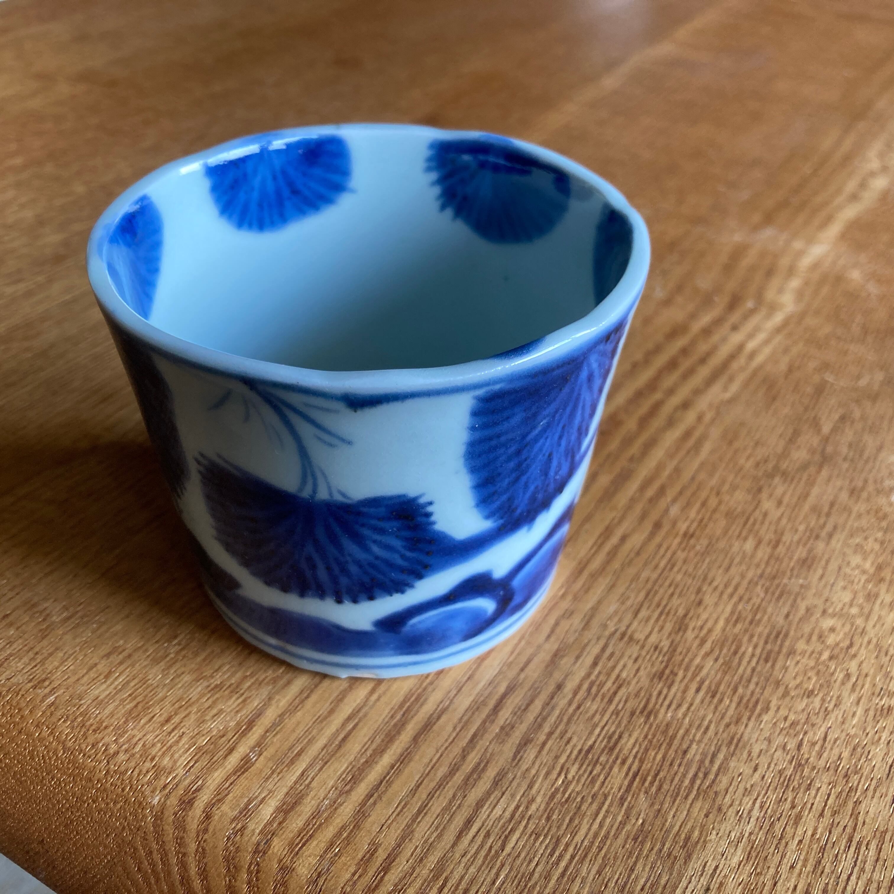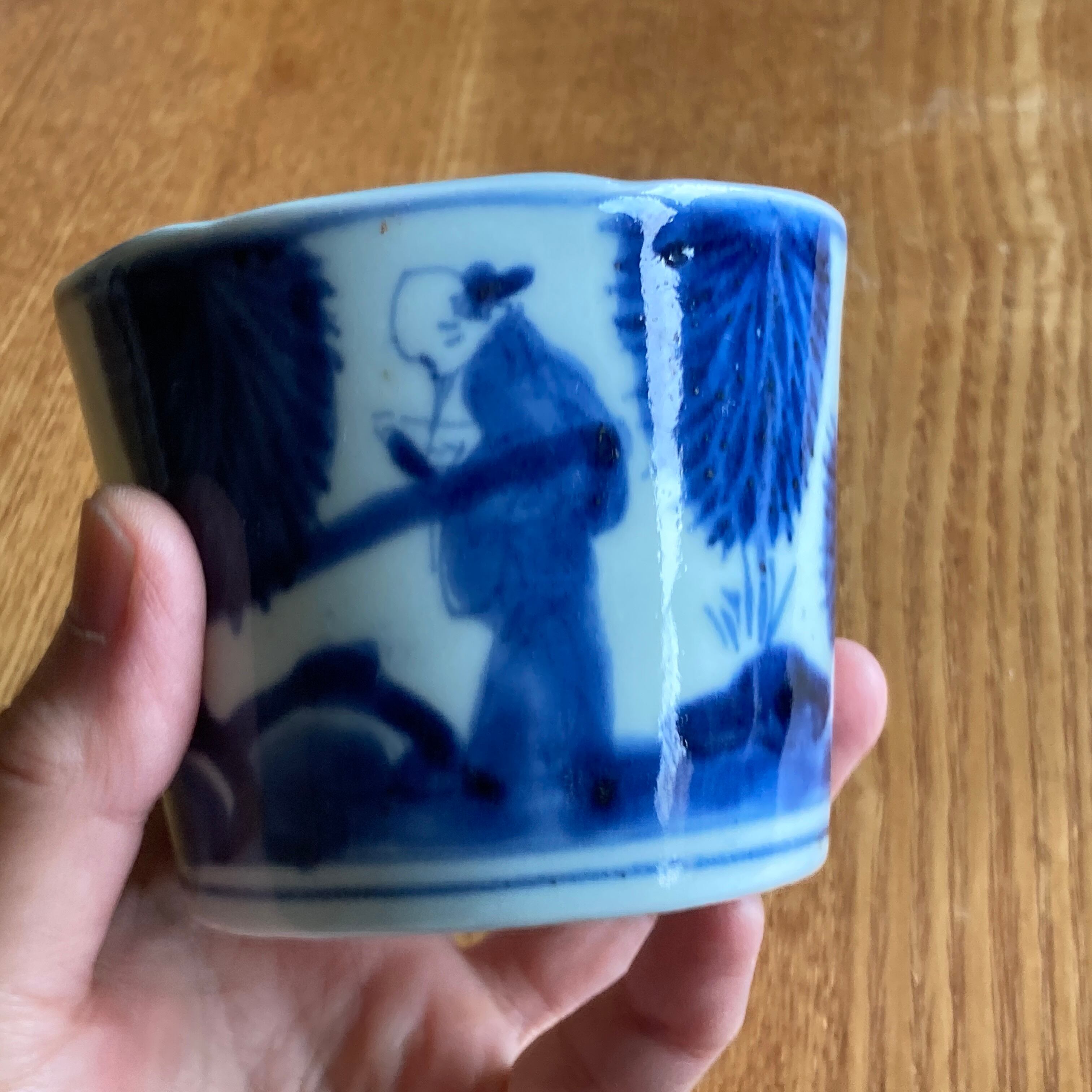 きれいな藍色の染付の柄が上品です。樹木の下に賢人が佇んでいる絵柄です。湯呑みやカップとして使っても良いですし、食卓で珍味を入れるうつわとしても活躍してくれそうです。うつわの内側口辺に描かれた模様があまり見ない、珍しい絵付けではないかと思われます。