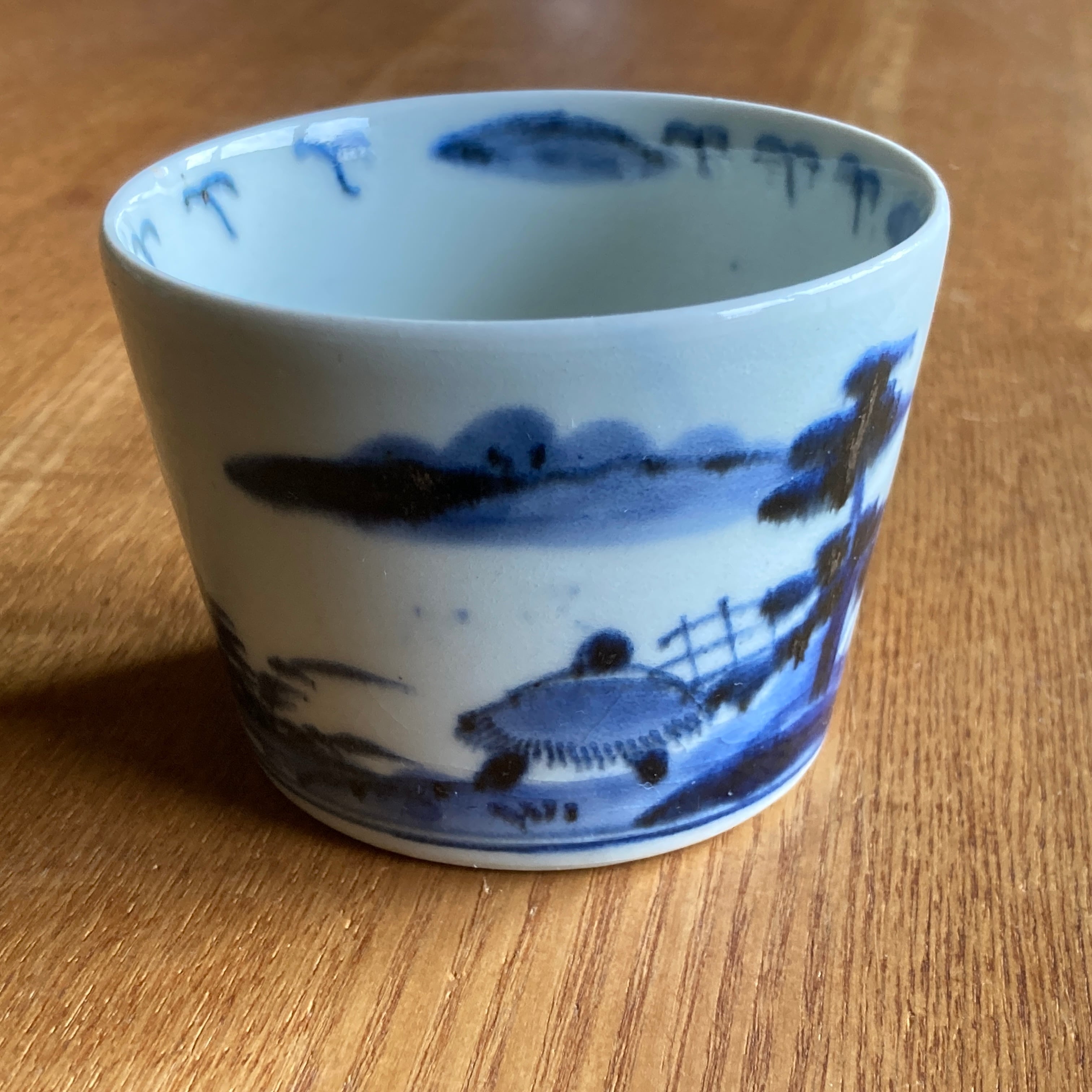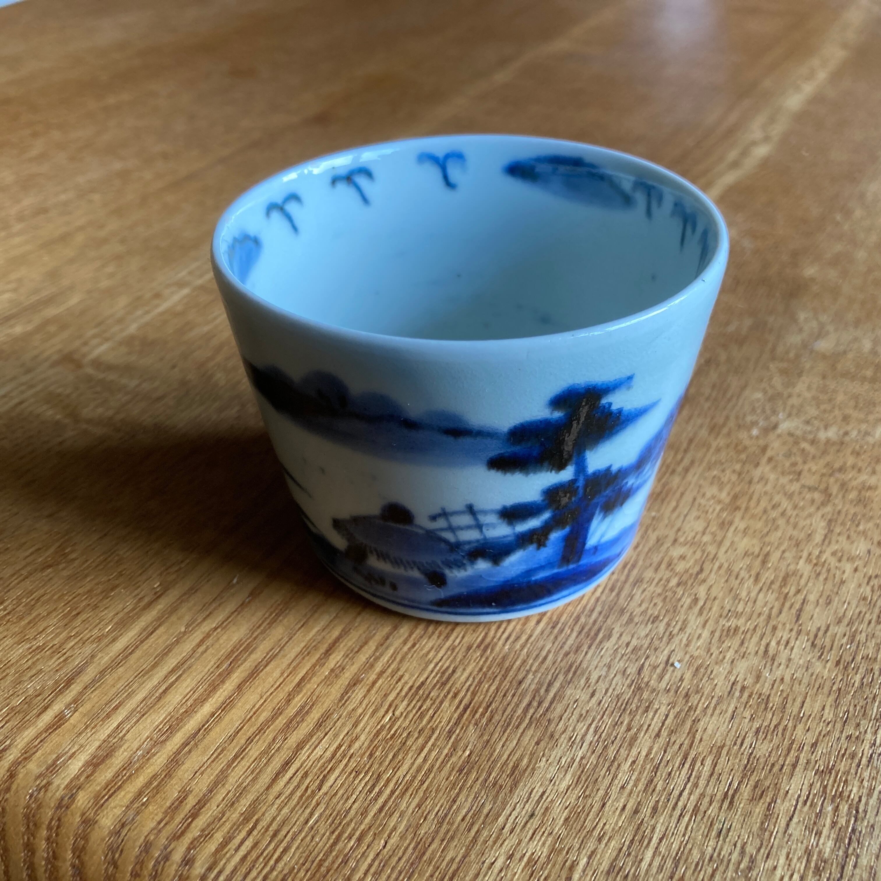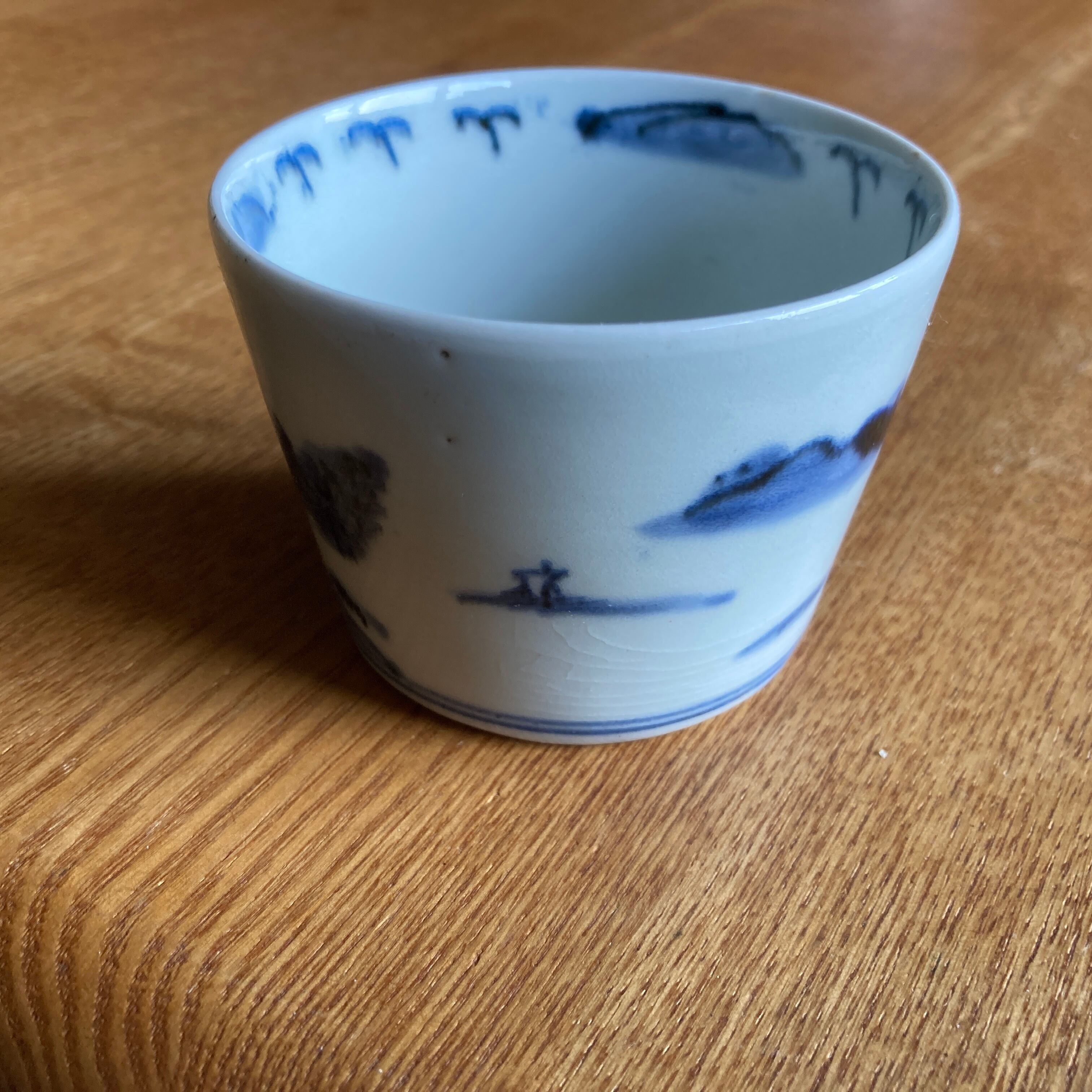 きれいな藍色の染付の柄が上品です。水辺に建つ東屋とはるかに湖上に浮かぶ舟。のどかな風景を染付で表現したそば猪口です。湯呑みやカップとして使うのにぴったりなサイズ感です。うつわの内側口辺に描かれた模様付けが、山と飛ぶ鳥なのでしょうか。あまり見ない絵付けではないかと思われます。