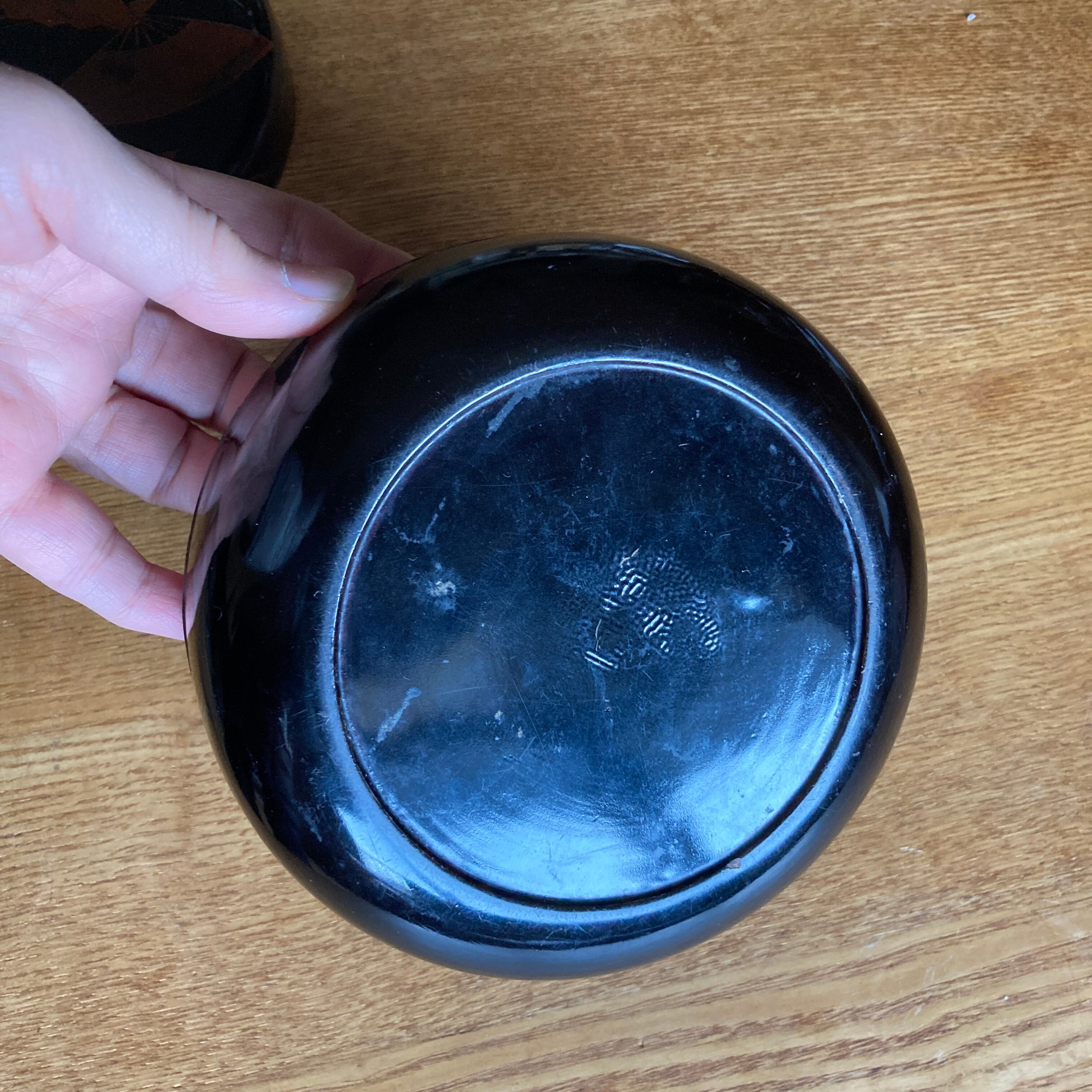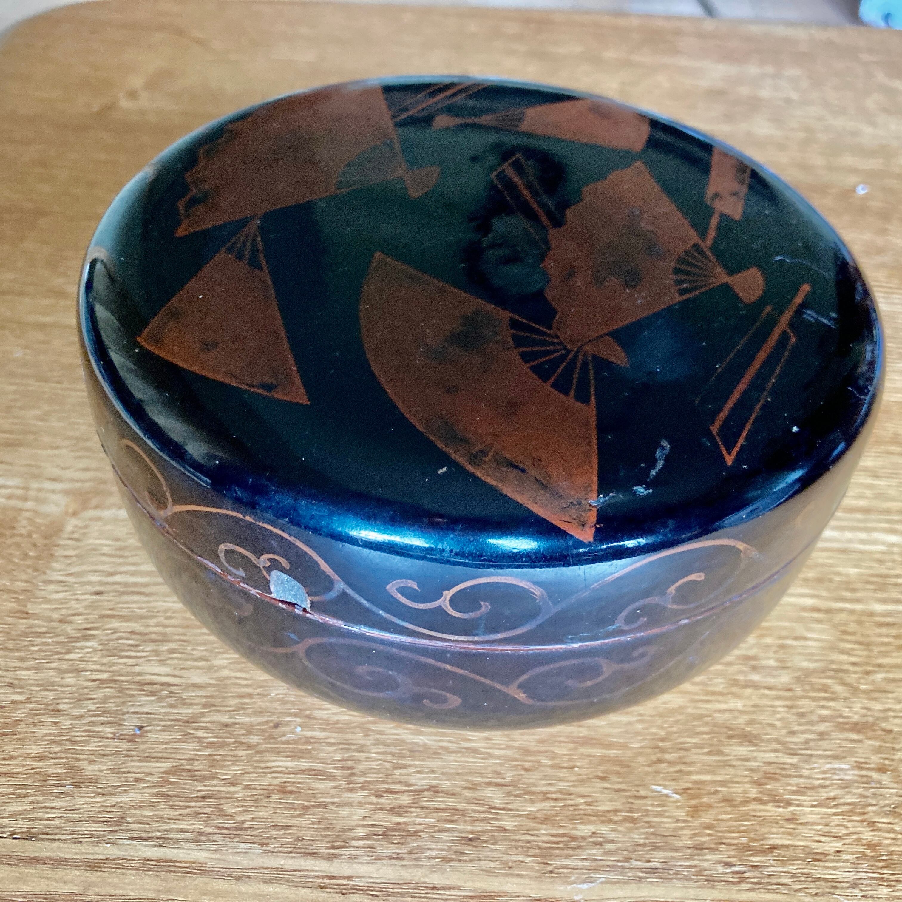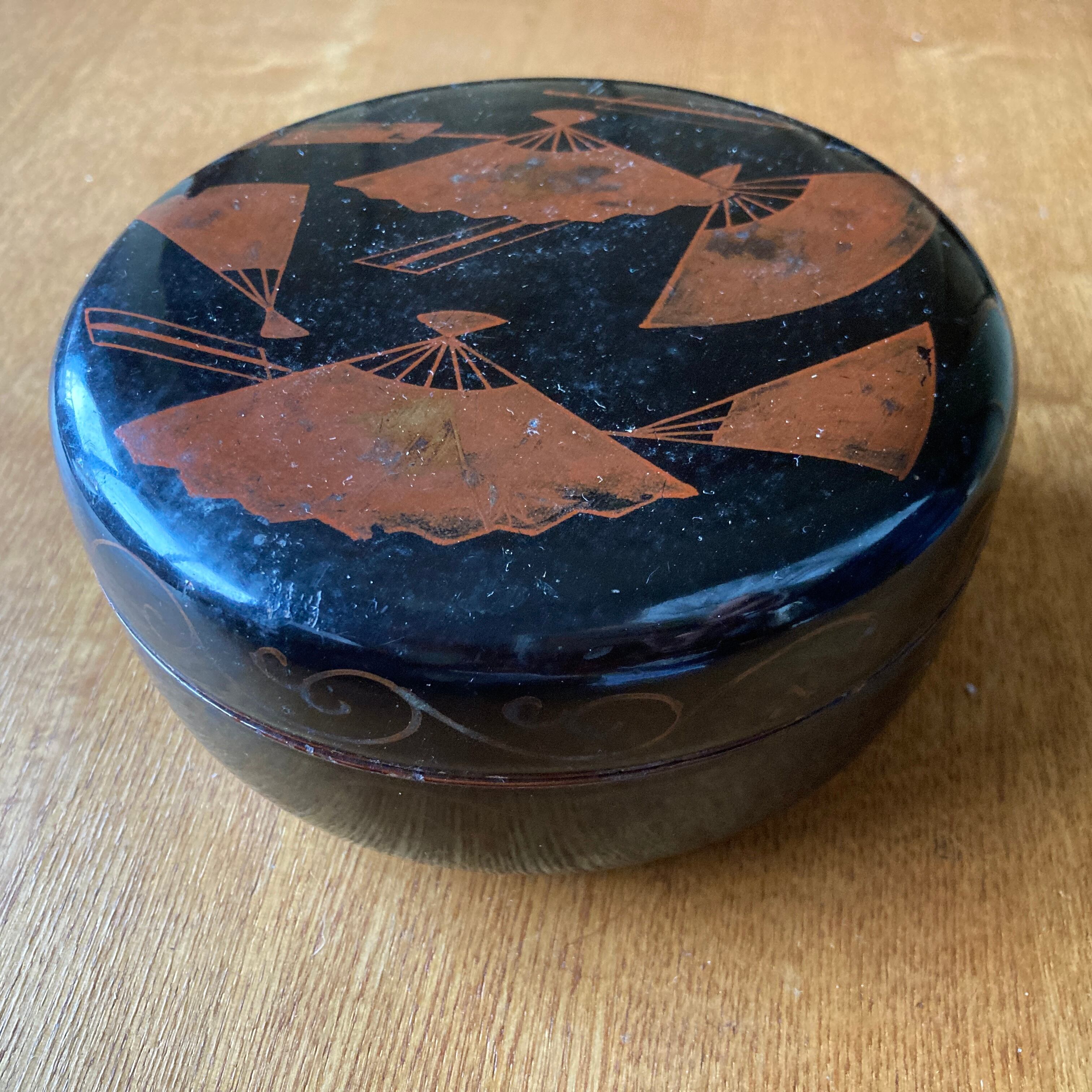 漆塗りで蒔絵模様が施された、小ぶりな菓子器です。黒地に扇面の模様が描かれています。菓子器や飾り箱、小物入れとしてお使いいただくのもオススメです。おそらく明治期〜大正期に作られたものではないかと思われますが、産地などの詳細は不明です。蓋の部分に一部欠けがあります。時代を経て塗りが程よく落ち着いた感じになり、漆塗りの骨董のお品としては生活のアクセントになってくれる上品なお品です。再生産の効かない古いお品。お気に召ましたら、ぜひどうぞ。