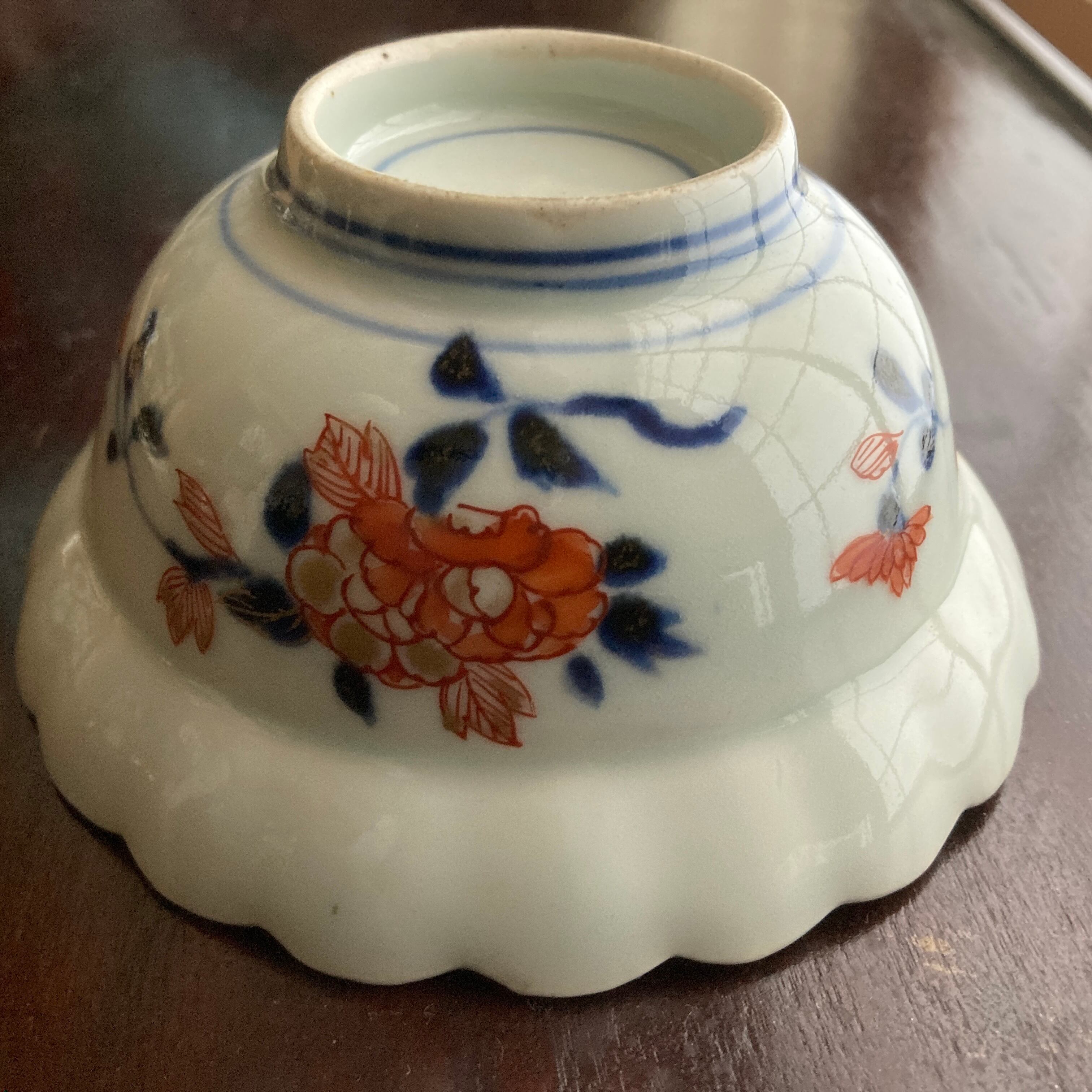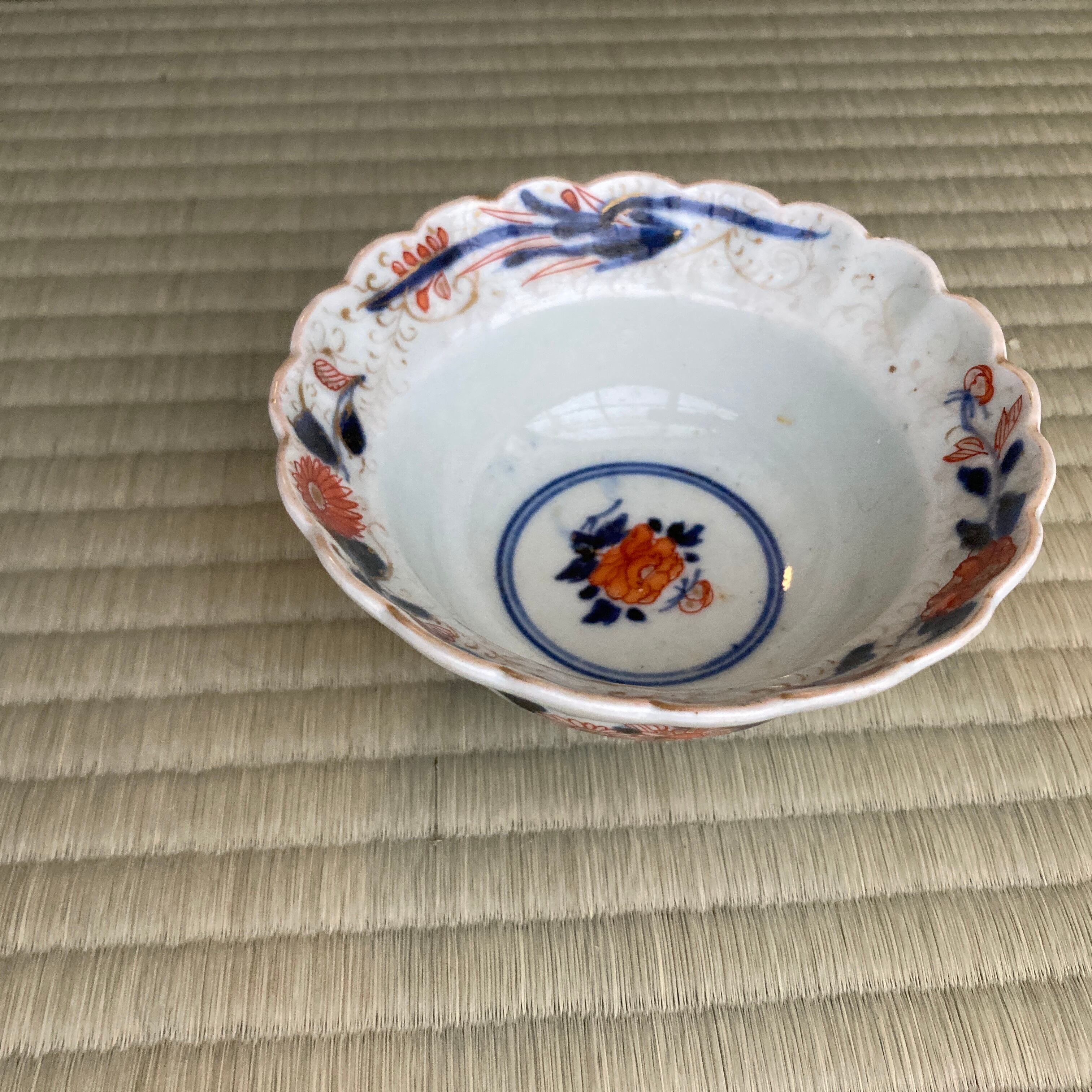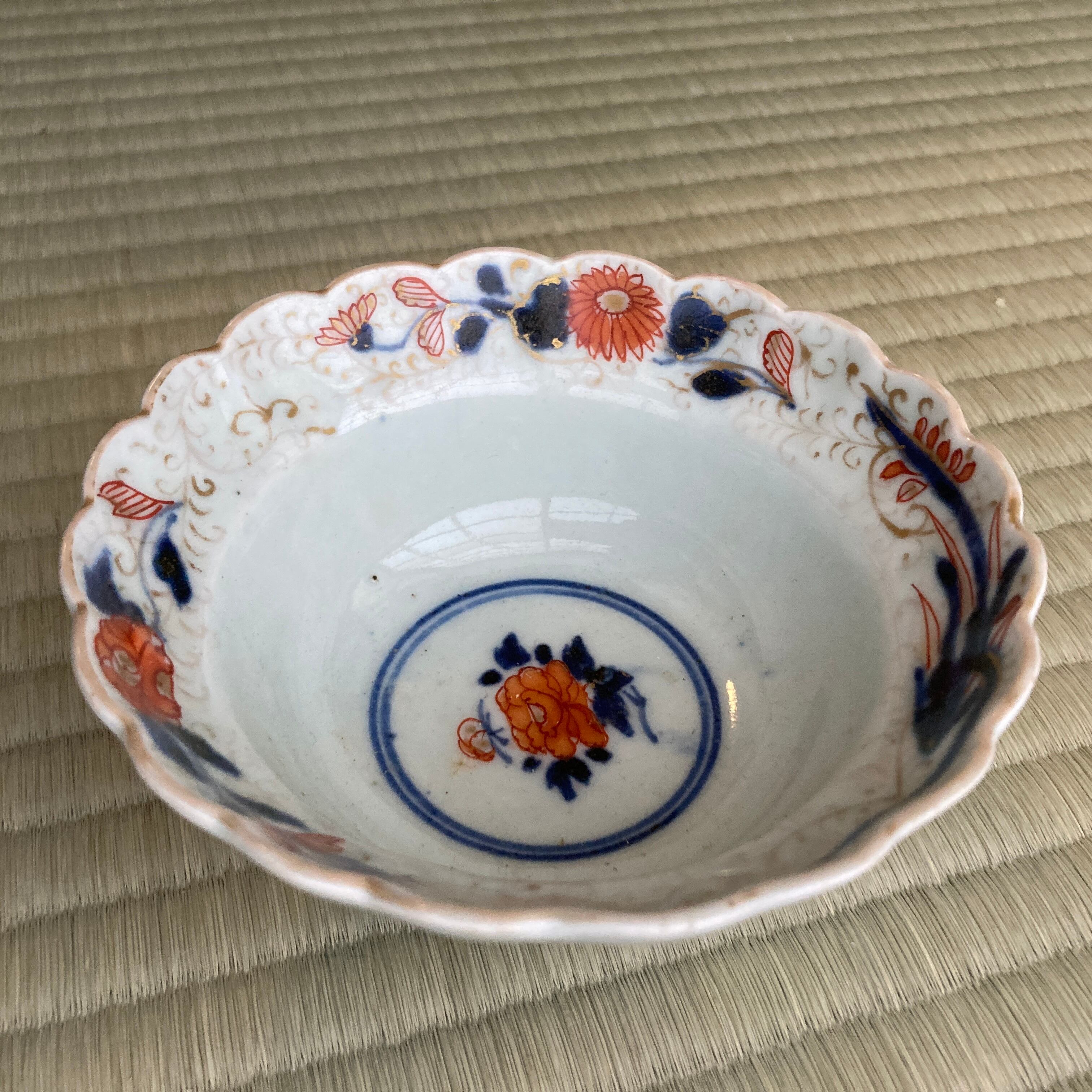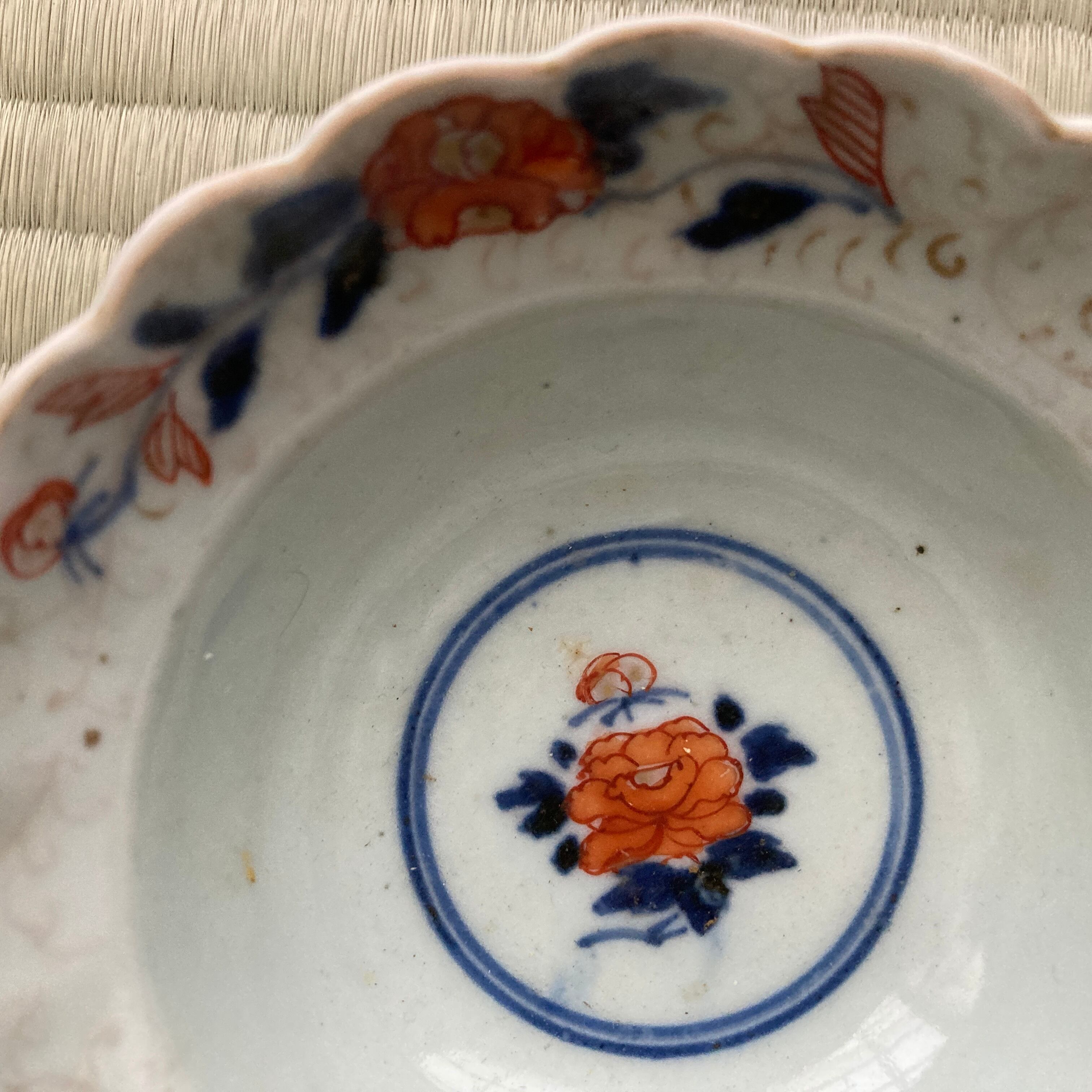 華やかな赤絵や金泥、染付とをうつわの内外に描いた、大変に華やかで上品な可愛らしさを感じるお品です。江戸中期・元禄頃の作です。見込みに牡丹、蘭の花が描かれ外側に開いた輪花型のうつわは錦手の中でも貴重なもので、輸出品として作られたものと思われます。25年ほど前にイギリスで見つけて購入したものです。購入後は保管状態でした。カケやニュウも見られません。ただ金泥はハゲて薄くなっている部分が多数あります。午後のお茶の時間に小さなお菓子などを盛ってみてはいかがでしょうか。このサイズと形、そしてこの時代の錦町で伊万里は入手が困難です。うつわとの一期一会の出会い。お気に召しましたら是非お手元に……。