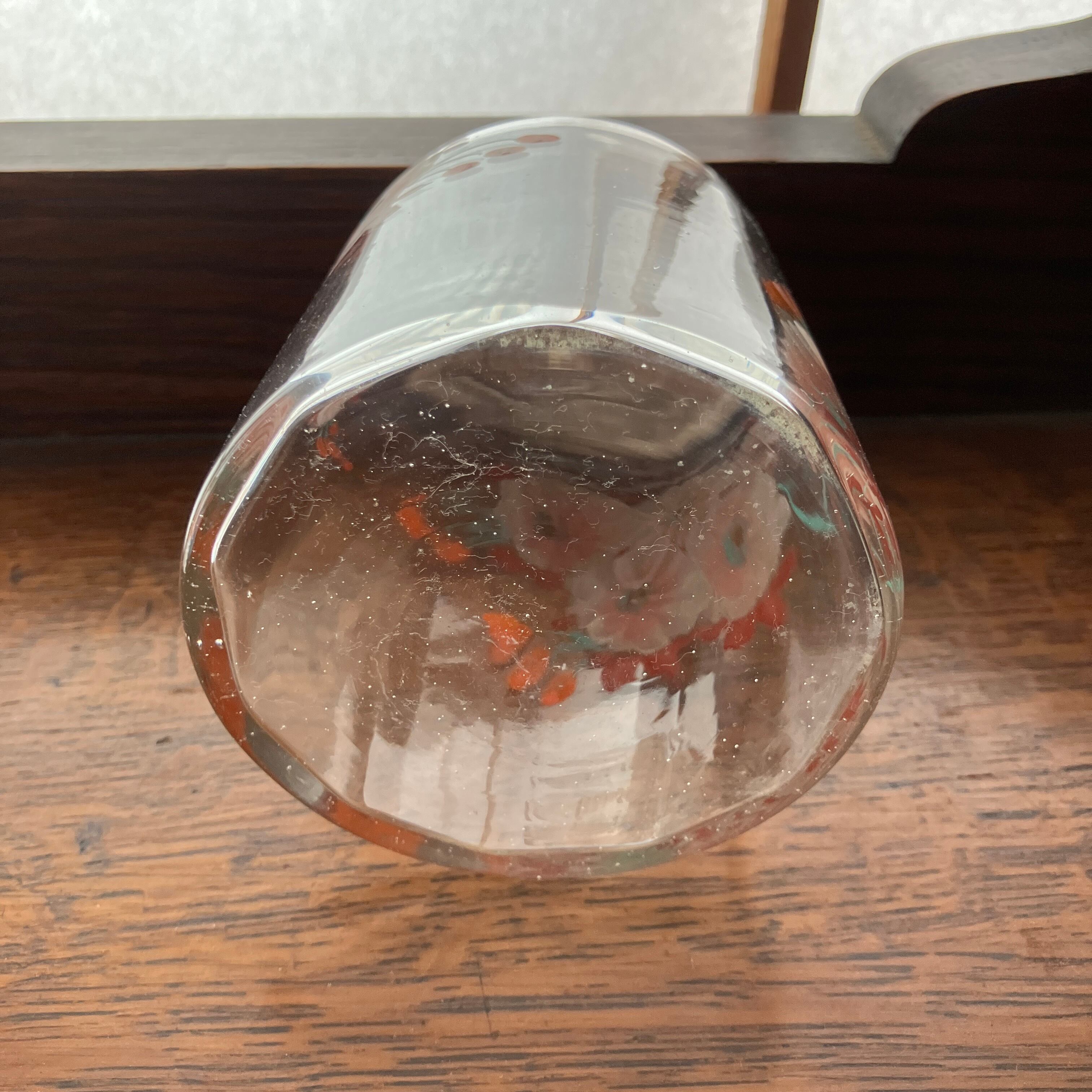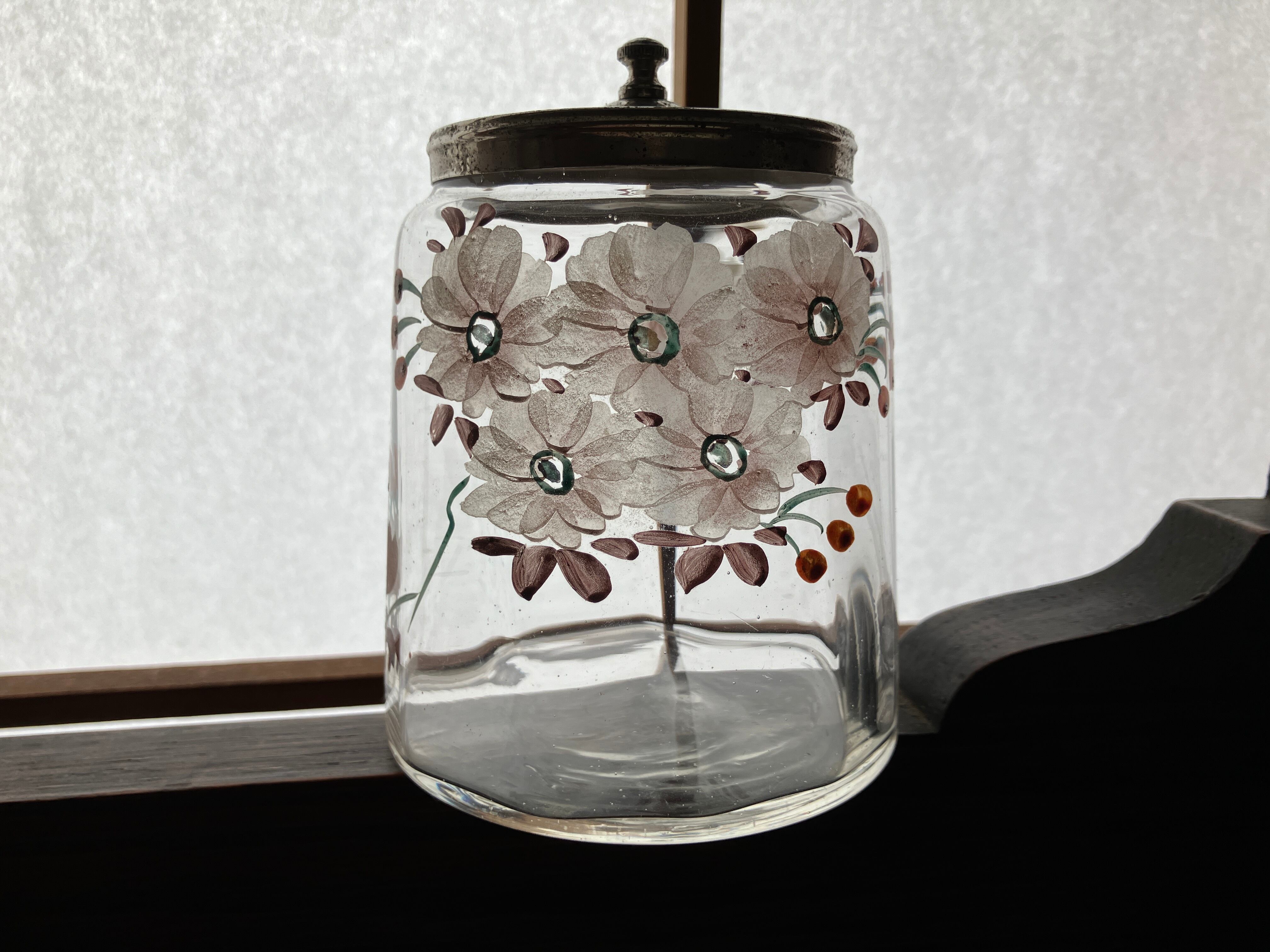 ガラスに手書きの絵付けが施された、上品で可愛らしいお品物です。ボンボニエール(ボンボン入れ、キャンディポット)と思われます。